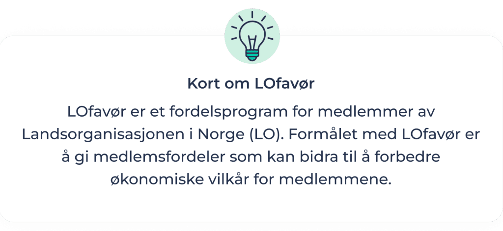 Som medlem i et LO-forbund får du tilgang til LOfavør, som gir spesielt gode tilbud på boliglån. I tillegg har fagforbundet fremforhandlet gunstige priser på forsikring, billån og andre banktjenester